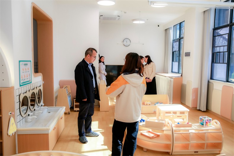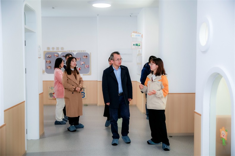 在托育園園長的介紹下,調研組一行實地考察了托育中心早發運動感統教室,繪本館,醫育結合測評室、醫務室,開放式托育屋(向日葵親子小屋)、母嬰室等園所環境,深入了解園所招生政策、收費標準與班級開設的具體狀況,對于中心的管理制度、文化理念、先進的軟硬件配套設施及多功能智慧托育服務平臺給予了充分肯定與高度評價。