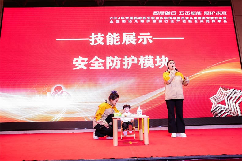活動現場特開展了技能展示環節,邀請2024年一帶一路暨金磚國家技能發展與技術創新大賽第二屆幼兒照護職業技能決賽一等獎隊伍及來自長沙市雨花區托育綜合服務中心的師生圍繞嬰幼兒“安全防護”“早期發展”等模塊,進行技能展示。