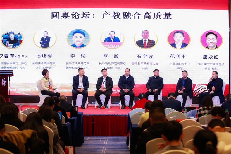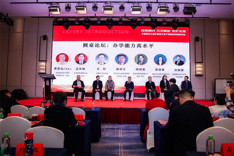大會同期開展了全國嬰幼兒照護服務行業產教融合專題論壇。岳陽職業技術學院黨委副書記、校長黃岳山,內蒙古民族幼兒師范高等專科學校校長李春暉,湖北幼兒師范高等專科學校校長秦偉文,長沙幼兒師范高等專科學校校長李毅,駐馬店幼兒師范高等專科學校校長李柯,貴州省早期教育協會會長石宇波等來自院校、行業、企業的14名代表圍繞“辦學能力高水平”“產教融合高質量”兩個主題開展圓桌對話,共享優秀辦學經驗、共研人才培養方案、共同探索嬰幼兒照護服務行業的高質量發展路徑。