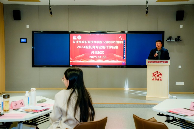 長沙民政職業技術學院民政與社會工作學院院長胡彬、金職偉業集團總經理潘建明博士,長沙民政職業技術學院嬰幼兒托育服務與管理專業帶頭人、教授黃鐵牛,教師瞿彭亞男,金職偉業產業學院院長劉瀟,長沙市雨花區托育綜合服務中心園長劉璐等出席開班儀式,長沙民政職業技術學院副教授許維主持。