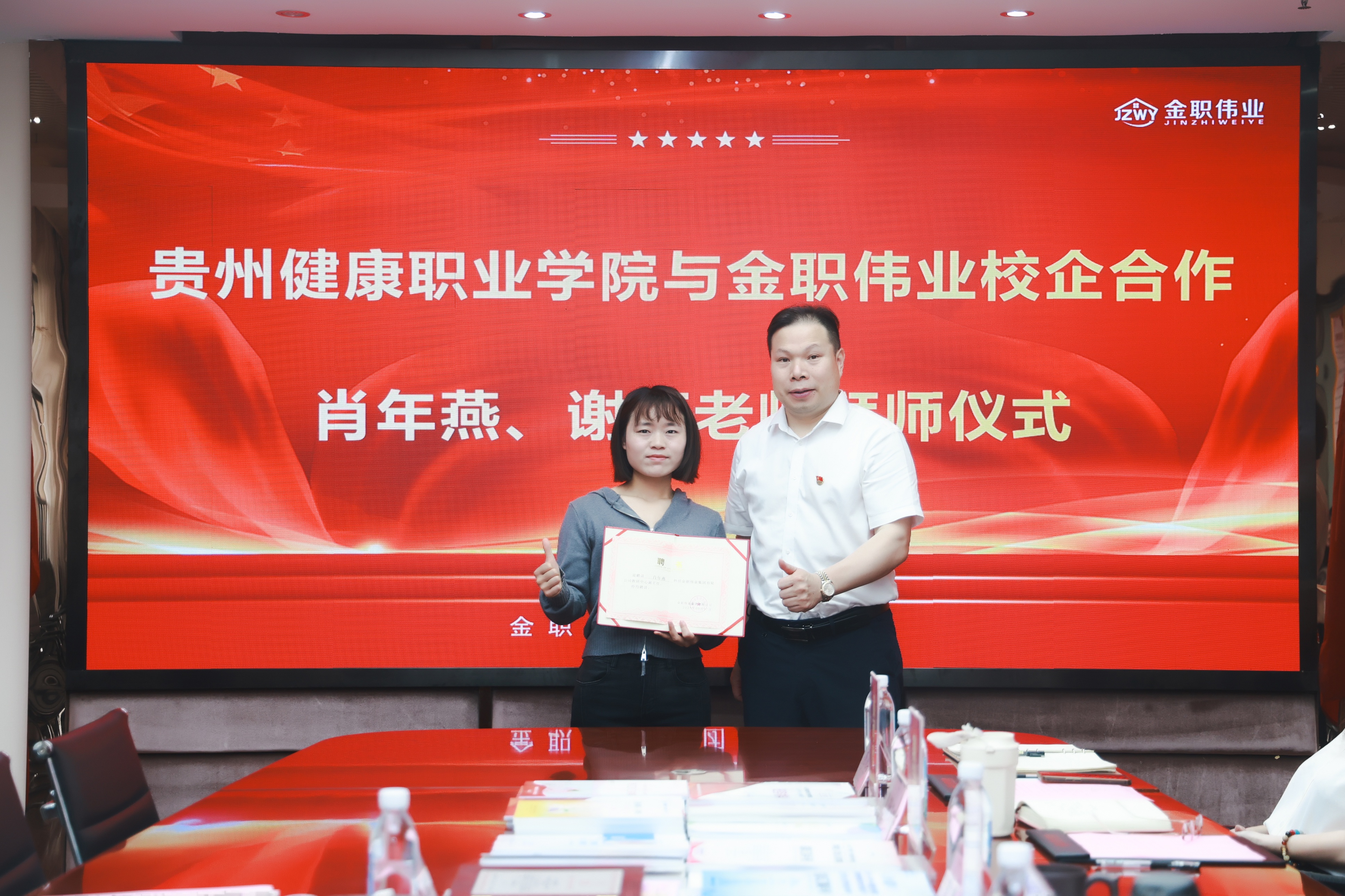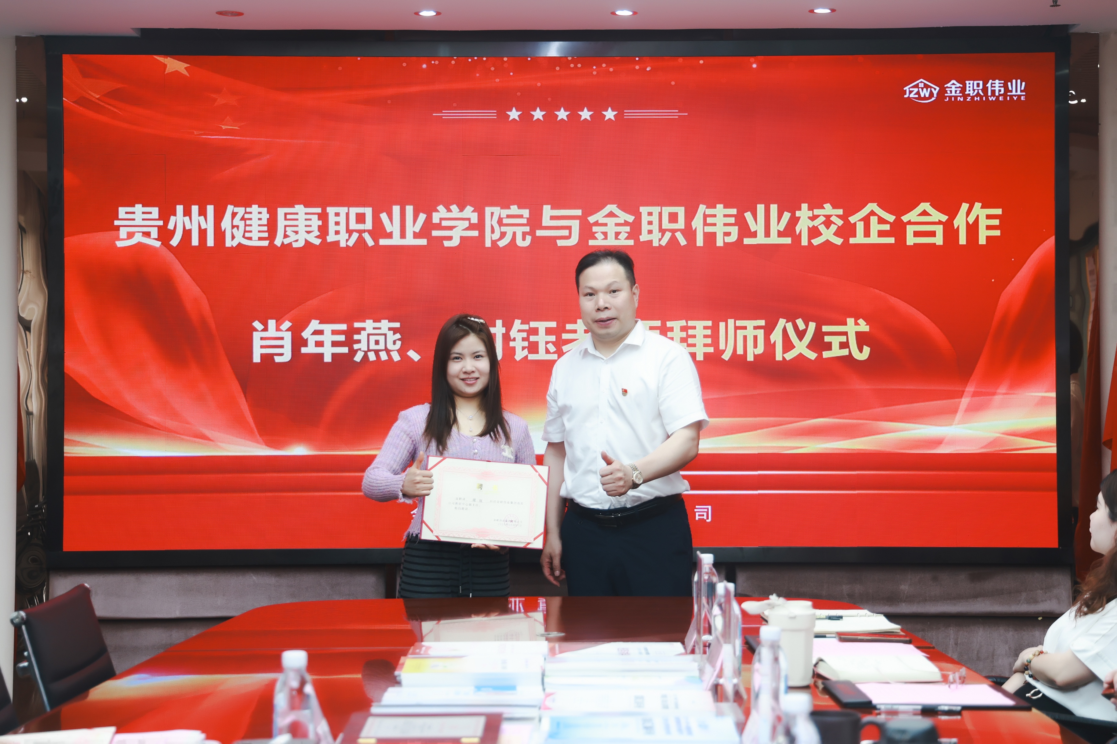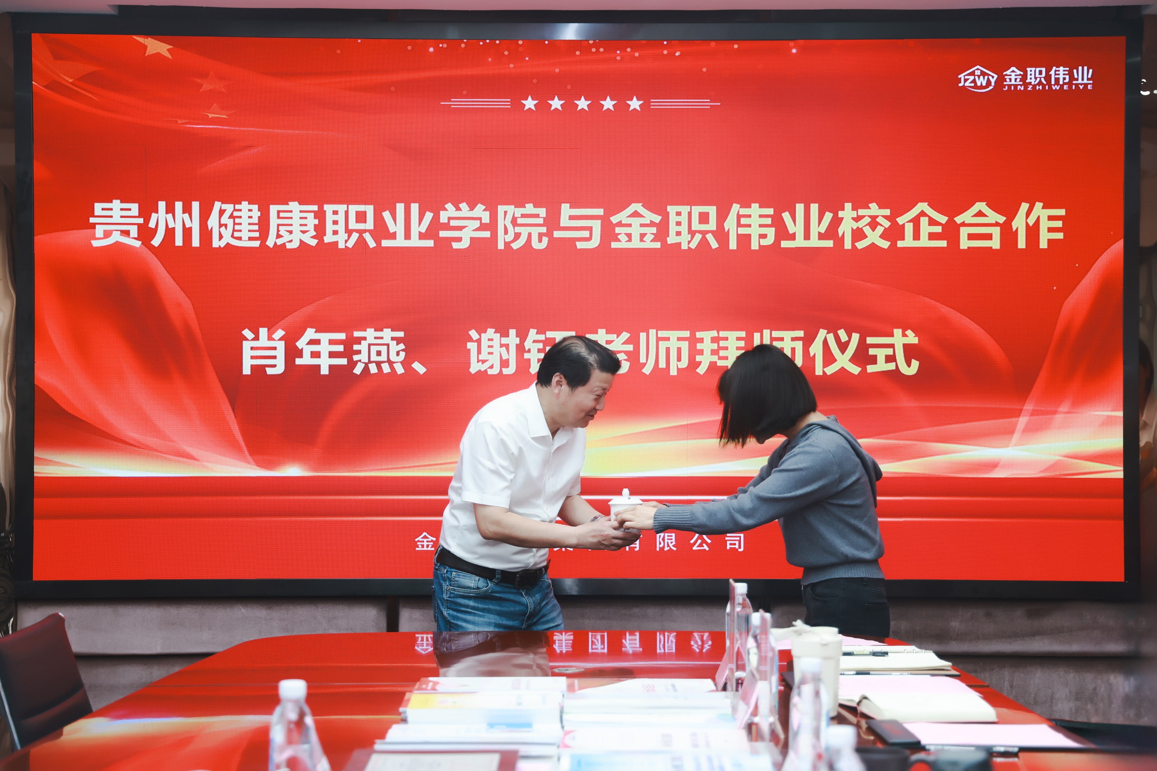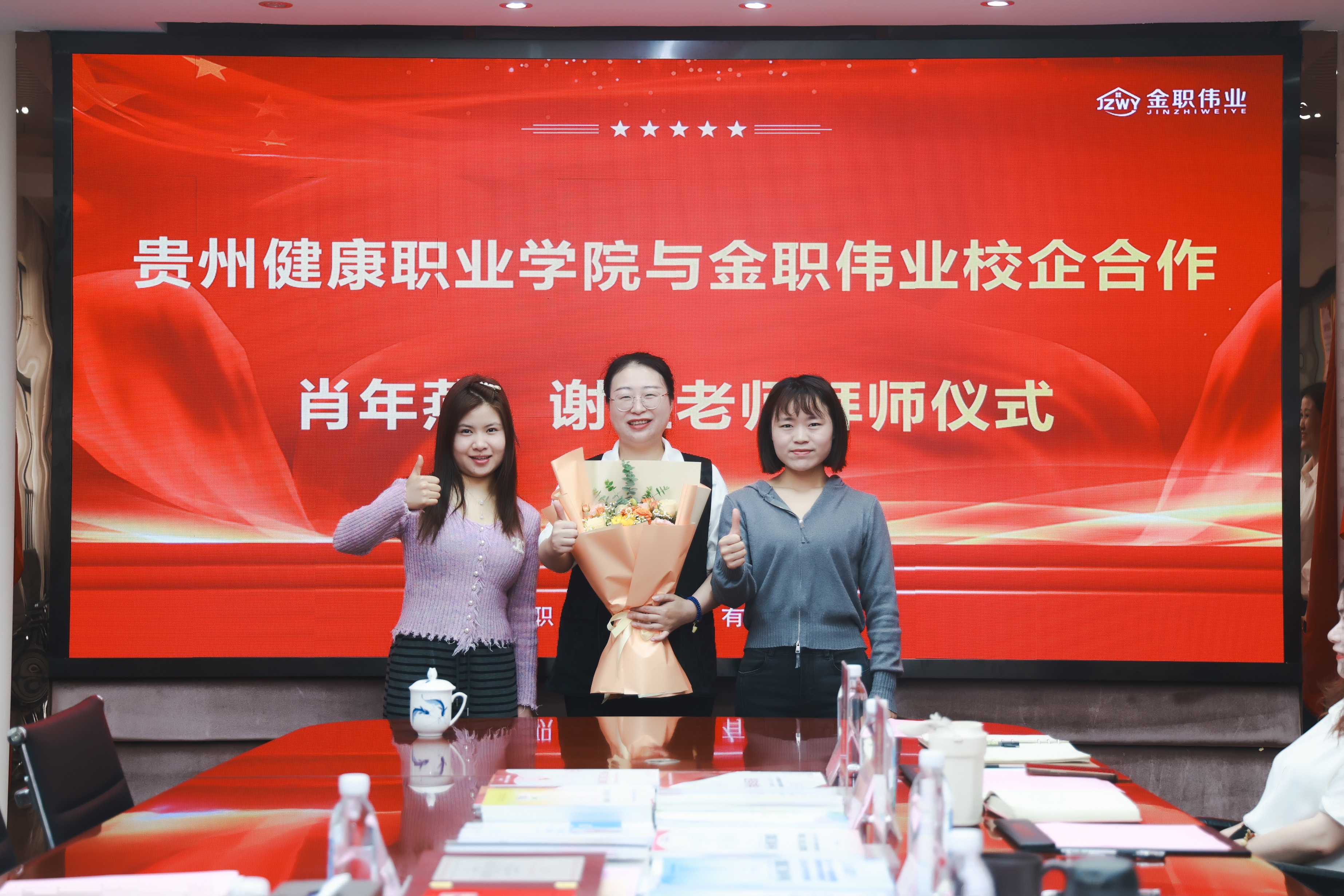 5月7日,貴州健康職業學院與金職偉業校企合作暨肖年燕、謝鈺老師拜師儀式順利舉行。金職偉業集團有限公司總經理潘建明、教研中心總監謝玉琳、邵漢清,產業學院院長劉瀟、教研中心主任陳萬方、副主任李偲婧參加活動。