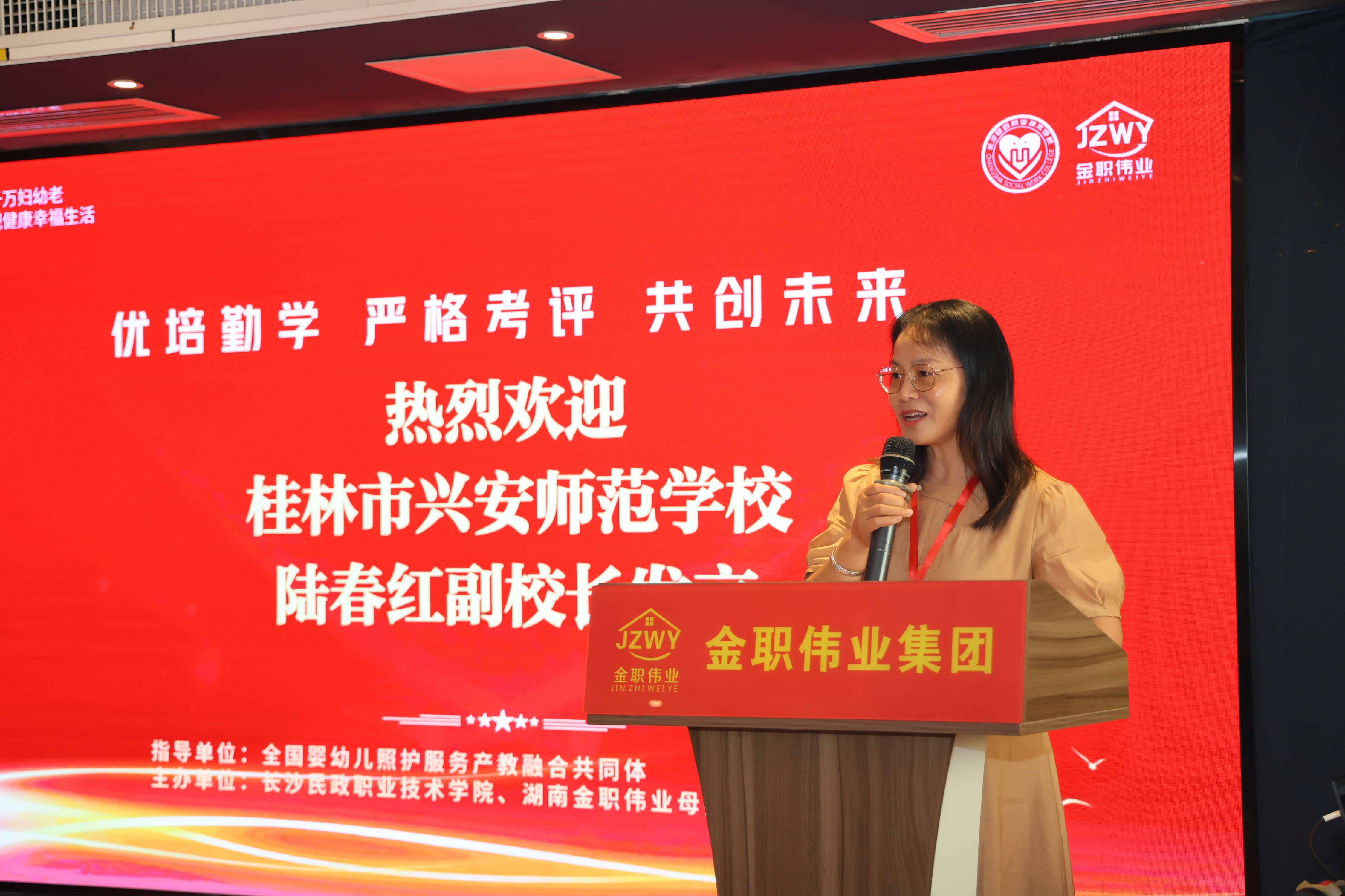 桂林市興安師范學校副校長陸春紅作為學員代表發言,她對金職偉業集團有限公司搭建的高水平學習平臺表示衷心感謝。她承諾將嚴格遵守培訓紀律,認真學習考務技術和督導評估規范,期待通過本次培訓與各院校、企業建立更緊密的合作關系,共同為托育服務行業培養更多高素質技術技能人才,為促進母嬰健康事業發展貢獻力量。