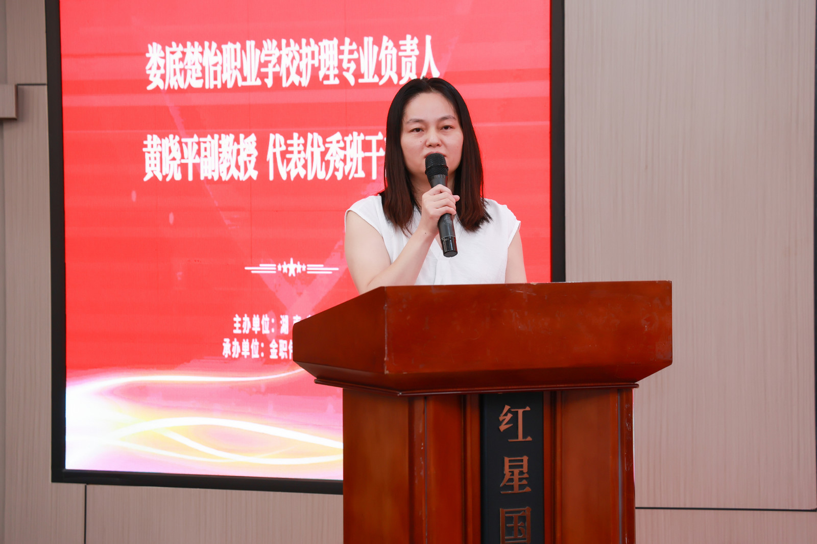 婁底楚怡職業學校護理專業負責人、副教授黃曉平作為優秀班干代表發言,她向為本次培訓提供支持的金職偉業集團及各位導師致以謝意,同時感謝全體學員在培訓期間的協作與信任。她提到,本次培訓體系將企業真實案例、智能護理技術等前沿內容融入課程,使參訓教師得以精準把握行業發展趨勢,并表示將把企業實踐中的管理經驗與教學創新思路帶回學校,推動護理專業課程與崗位需求的深度對接。