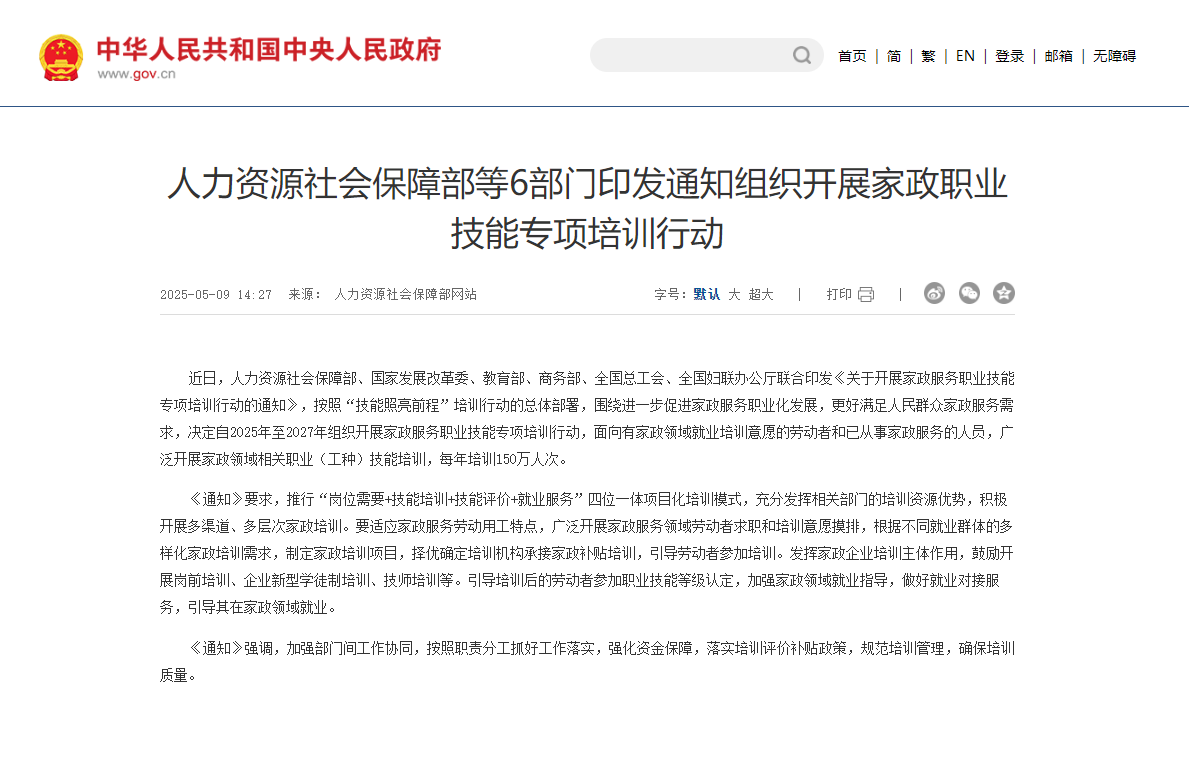 為進(jìn)一步促進(jìn)家政服務(wù)職業(yè)化發(fā)展,更好滿足人民群眾家政服務(wù)需求,按照人力資源社會(huì)保障部、財(cái)政部關(guān)于實(shí)施“技能照亮前程”培訓(xùn)行動(dòng)的總體安排,人力資源社會(huì)保障部、國(guó)家發(fā)展改革委、教育部、商務(wù)部、全國(guó)總工會(huì)、全國(guó)婦聯(lián)決定自2025年至2027年組織開(kāi)展家政服務(wù)職業(yè)技能專項(xiàng)培訓(xùn)行動(dòng)。