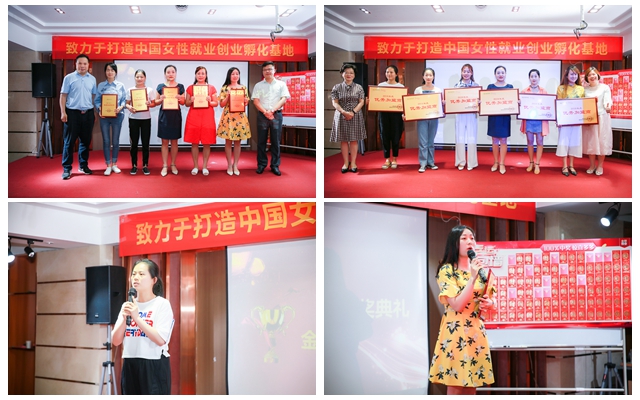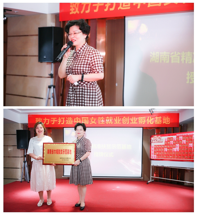 長沙市婦聯黨組書記、主席文方為金職偉業頒發“湖南省巾幗脫貧示范基地”榮譽牌匾,金職偉業董事長彭英女士上臺接受牌匾。