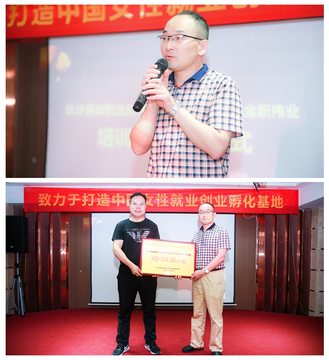 同時,長沙民政職業技術學院繼續教育學院院長徐懷為金職偉業頒發了“長沙民政職業技術學院繼續教育學院金職偉業培訓基地”榮譽牌匾,金職偉業總裁潘建明先生上臺接受牌匾。