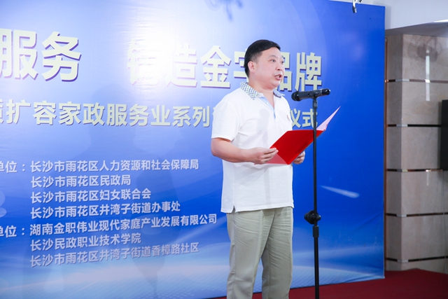 啟動(dòng)儀式由長沙市雨花區(qū)人力資源和社會(huì)保障局、長沙市雨花區(qū)民政局、長沙市雨花區(qū)井灣子街道辦事處聯(lián)合主辦,湖南金職偉業(yè)現(xiàn)代家庭產(chǎn)業(yè)發(fā)展有限公司、長沙民政職業(yè)技術(shù)學(xué)院、長沙市雨花區(qū)井灣子街道香樟路社區(qū)共同承辦。