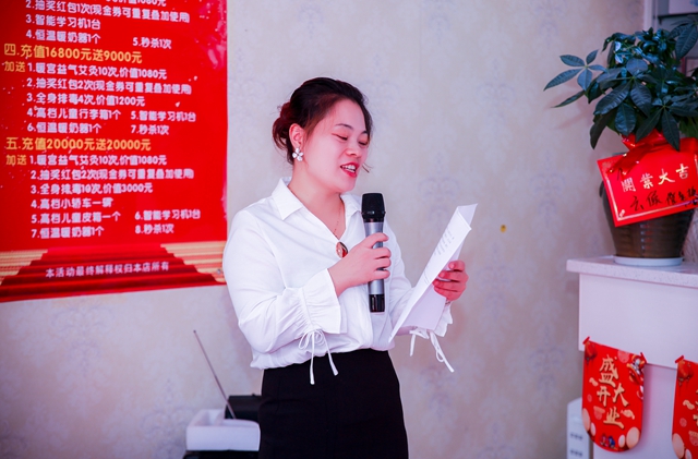 作為慶典的主角,金嬰麗人湘潭易俗河店創始人陳喬發表致辭。她首先對領導、嘉賓、客戶的到來表示熱烈歡迎及誠摯感謝。她表示:金嬰麗人湘潭易俗河店采用的是一站式服務模式,分母嬰用品、小兒游泳推拿、產后康復護理三大區域,希望能夠給用戶帶來全方位的貼心便利服務。在今后,她一定會堅守母嬰行業,致力于建立金嬰麗人品牌和顧客之間的情感連接,加倍提升用戶服務體驗。