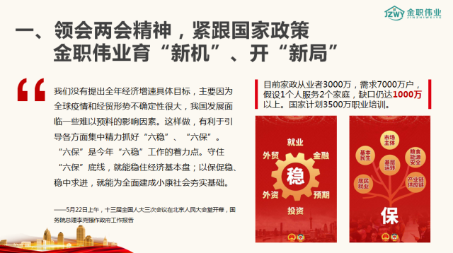 而目前家政從業者達到3000萬人,市場需求達到7000萬戶,假設1名家政從業者服務2個家庭,缺口仍達1000萬以上。家政服務行業需求巨大,市場卻處于供不應求的態勢。在此情況下,政策春風吹進家政行業,國家計劃開展3500萬人數的職業技能培訓。此時,全國范圍內的新冠疫情也基本得到了控制,經濟開始逐步復蘇,在這種情況下我們更要抓住時機,把握機遇,穩中求進,深入領悟兩會精神,緊跟國家政策,統一思想、統一認識、統一行動,緊扣全年任務目標,真抓實干,提高化危為機、危中尋機的能力,一步一個腳印堅定前行,我們定能克服重重困難,統籌做好疫情防控和順應經濟社會發展的各項工作。