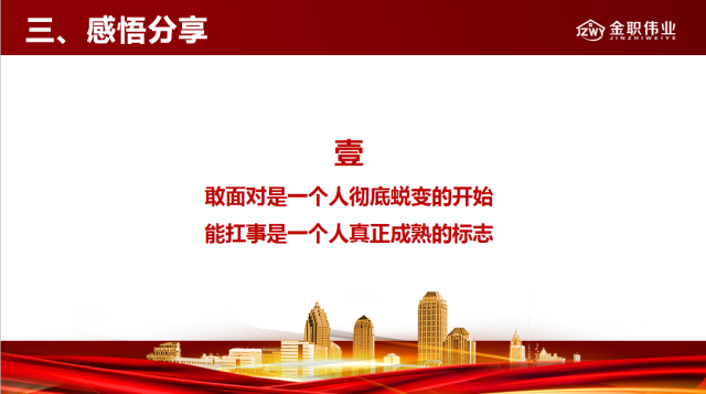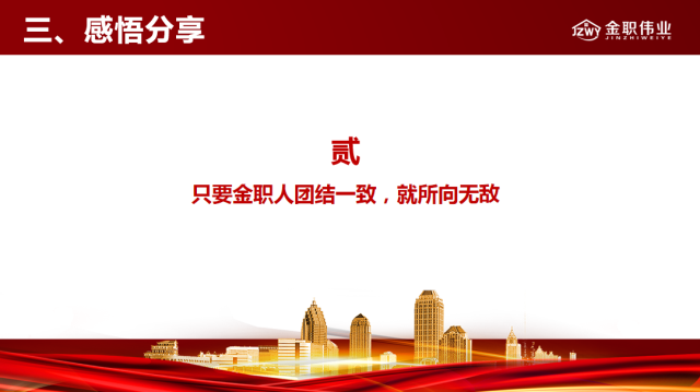 在這個世界上,任何一個人的力量都是渺小的,只有完全融入團隊,與團隊一起奮斗,才能實現個人價值的最大化,才能實現共贏。金職偉業的家人們都是為了實現同一個目標才相聚于此,只要金職人團結一致,我們無論遇到什么困難、險阻,都所向無敵。
