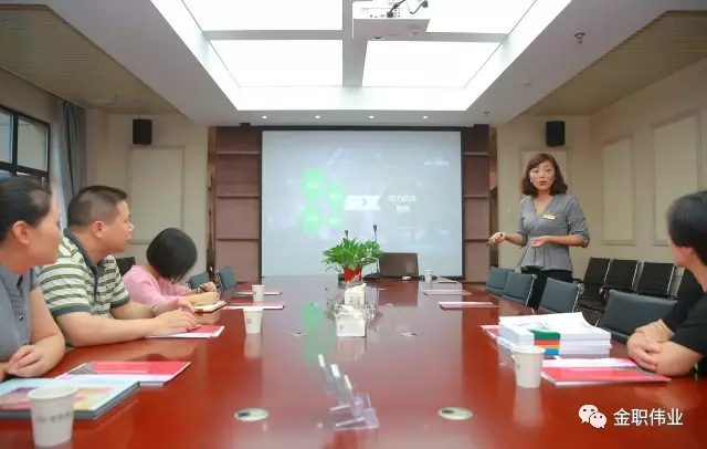 金職偉業集團總裁潘建明先生、運營總經理黃娟女士對敬主任的蒞臨表示熱烈歡迎及衷心感謝。金職偉業培訓學校陳波校長對公司運營情況、成果等進行了詳細匯報;金職偉業研發部主任李瓊老師則介紹、展示了金職偉業最新研發的教材、產康套盒等。