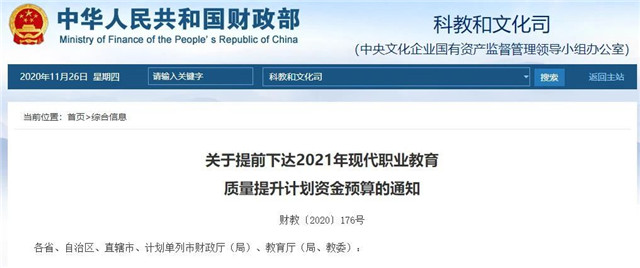 近日,財政部、教育部發布《關于提前下達2021年現代職業教育質量提升計劃資金預算的通知》(以下簡稱《通知》)??傆嬵A算高達2314037萬元,其中,高職院校生均撥款獎補資金1353287萬元,中職學校改善辦學條件獎補資金900000萬元,職業院校教師素質提高計劃獎補資金60750萬元。