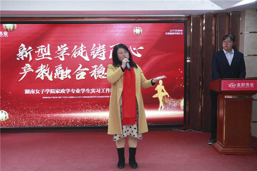 最后,湖南女子學院家政學系主任梁小燕發(fā)表講話。“通過此次實習,我看到了全體學生的成長,也很感謝金職偉業(yè)提供實習機會,讓我們的學生實現(xiàn)了從學校步入職場的完美過渡。”梁主任也希望,在今后,有更多的學生成為家政行業(yè)的骨干力量,推動家政行業(yè)的蓬勃發(fā)展,為這一項偉大事業(yè)貢獻自己的一份力量。