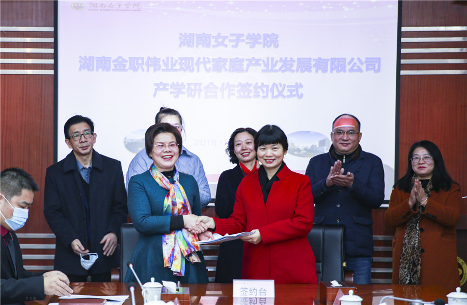 1月14日上午,湖南女子學院產學研合作簽約儀式在湖南女子學院辦公樓內隆重舉行。金職偉業與湖南女子學院共同簽署“產學研合作協議”,金職偉業正式被授牌為“產學研合作教育基地”,湖南金職偉業集團董事長彭英被聘為“湖南女子學院校外兼職導師”。