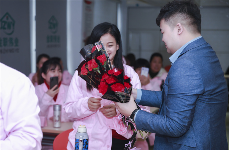 緊接著,總經理潘建明攜全體男職工為在座每位女性送上鮮花和祝福,祝愿她們生活幸福美滿,青春永駐。