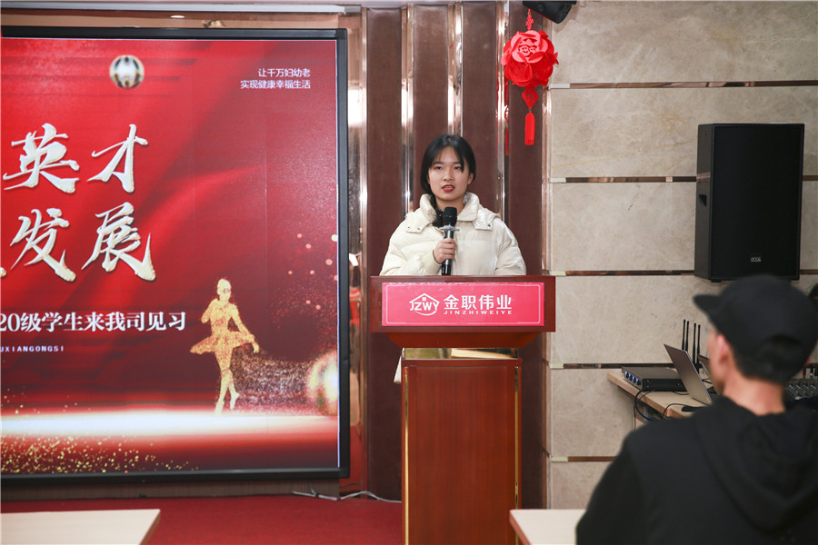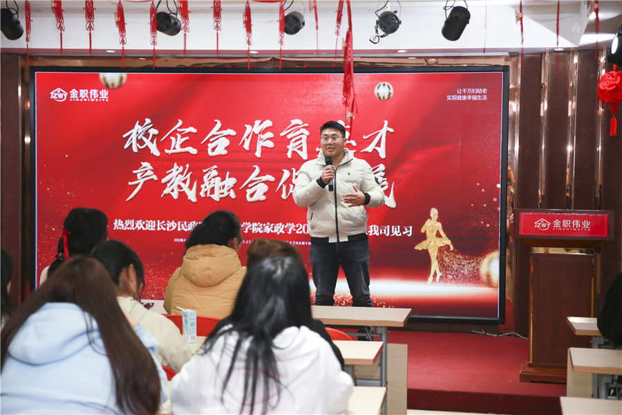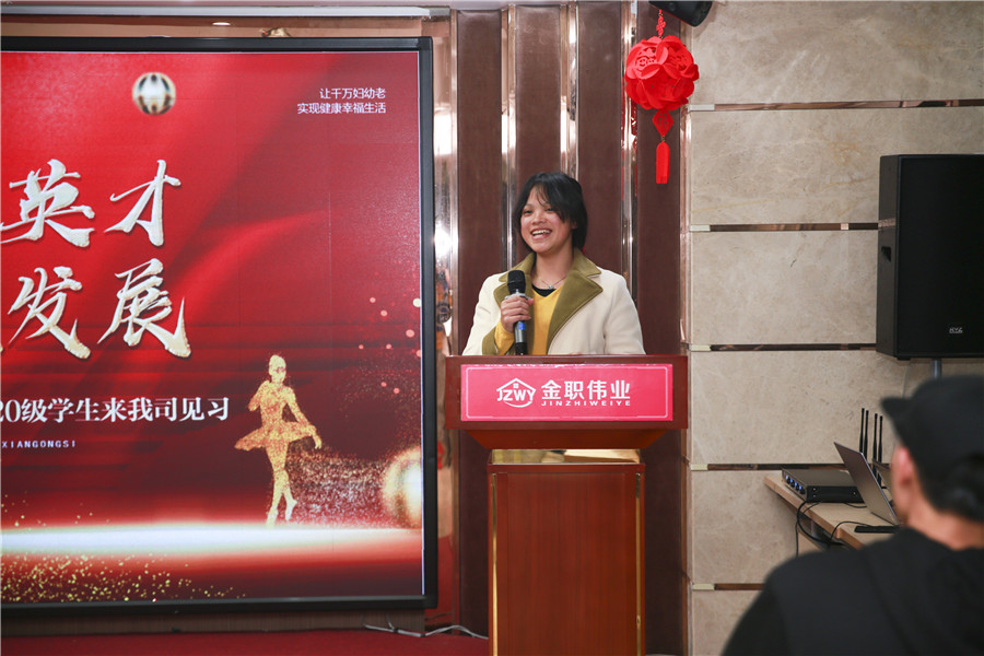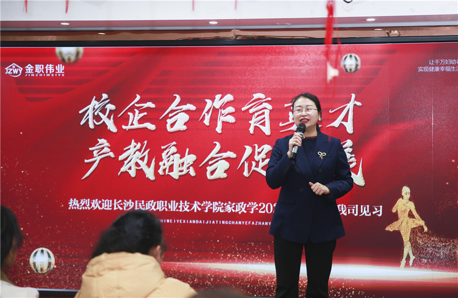 活動伊始,金職偉業培訓學校副校長陳萬方進行發言。她首先對在座的90余位家政學學生在見習期間的表現表示高度贊揚,“很感謝長沙民政職業技術學院一直以來對金職偉業的大力支持,長期以來,雙方進行深度校企合作,不僅建立‘校企合作中心’,打造就業、創業孵化基地,還為我司輸送了一批又一批的優秀人才。”最后,陳萬方希望學生們在今后能夠掌握更多專業知識,不斷提升自身綜合素養,成為一名合格的家政人。