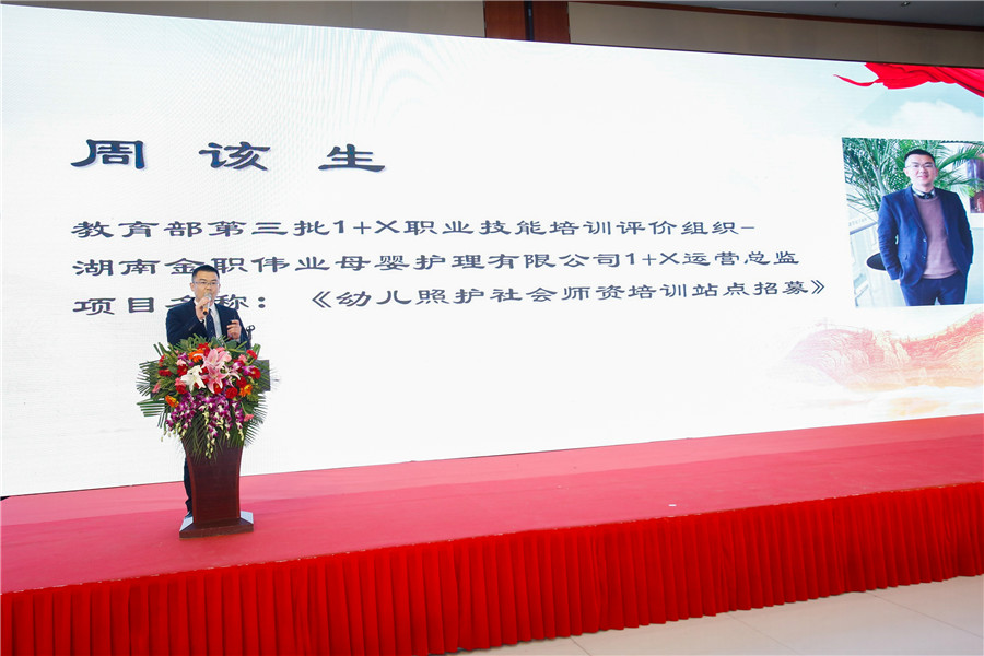 湖南金職偉業(yè)集團(tuán)大市場(chǎng)總監(jiān)周該生作為教育部第三批1+X職業(yè)教育培訓(xùn)評(píng)價(jià)組織代表,就“教育部1+X幼兒照護(hù)職業(yè)技能等級(jí)證書”項(xiàng)目在會(huì)上進(jìn)行講解。他首先就1+X幼兒照護(hù)職業(yè)技能等級(jí)證書開發(fā)情況、項(xiàng)目優(yōu)勢(shì)、工作成效、社會(huì)效益、社會(huì)師資培訓(xùn)站點(diǎn)招募等方面進(jìn)行介紹,隨后還分享了金職偉業(yè)在幼兒照護(hù)人才培養(yǎng)中的新思路、新做法,贏得與會(huì)專家一致好評(píng)。