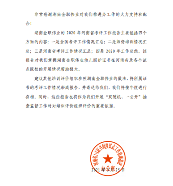 近日,河南省1+X證書(shū)制度試點(diǎn)工作協(xié)調(diào)推進(jìn)辦公室對(duì)于金職偉業(yè)2020年度1+X幼兒照護(hù)職業(yè)技能等級(jí)證書(shū)河南省考評(píng)匯報(bào)工作給予高度評(píng)價(jià),并倡議其他培訓(xùn)評(píng)價(jià)組織積極學(xué)習(xí)相關(guān)做法。