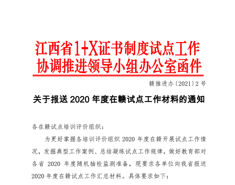 3月31日,江西省1+X證書制度試點工作協調推進領導小組辦公室發布《關于報送2020年度在贛試點工作材料的通知》(以下簡稱《通知》),《通知》要求各培訓評價組織向江西省報送2020年度在贛試點工作匯總材料,由湖南金職偉業母嬰護理有限公司匯編的《1+X幼兒照護職業技能等級證書考評匯報材料》(江西省)被作為案例示范,
