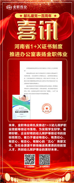 此工作的推進,受到了各級部門的一致好評。值得一提的是,近日,河南省1+X證書制度試點工作協調推進辦公室對于金職偉業2020年度1+X幼兒照護職業技能等級證書河南省考評匯報工作給予高度評價,并建議其他培訓評價組織能參照金職偉業的做法,將所屬證書的考評工作情況形成報告。
