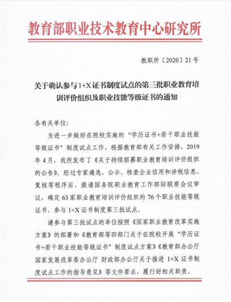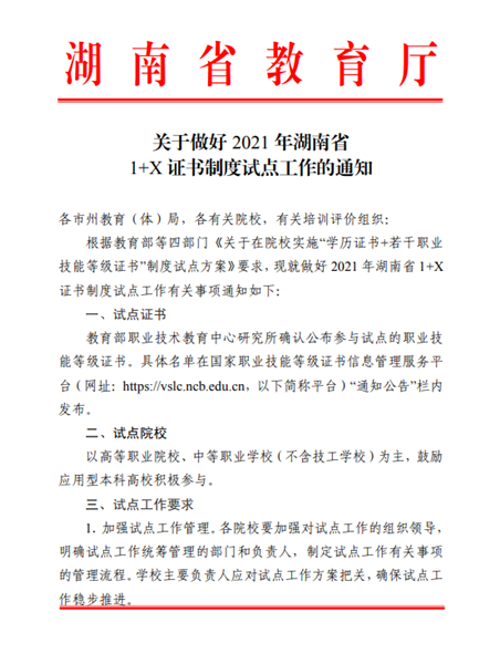 為了穩步推進1+X證書制度試點工作,建立健全工作機制、加強應用研究、鼓勵先行先試、注重師資培訓,鼓勵支持一大批行業影響力大、專業特色鮮明、建設基礎較好的院校積極參與試點工作,4月12日,湖南省教育廳下發《關于做好2021年湖南省1+X證書制度試點工作的通知》(簡稱《通知》)。《通知》指出,2021年首輪試點計劃申請提交時間為4月15日至4月30日,1+X幼兒照護、產后恢復職業技能等級證書也可于4月15日同步啟動申報。