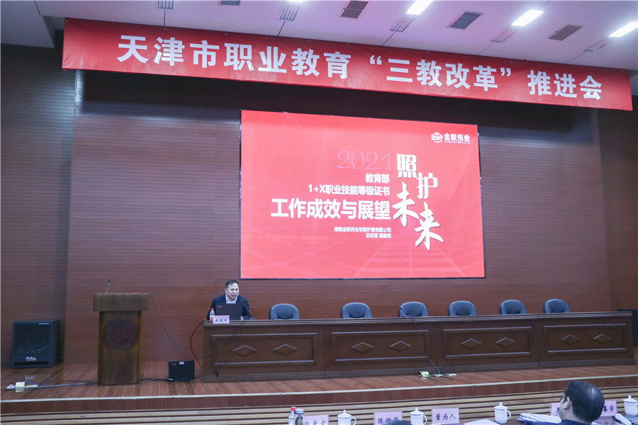 為貫徹落實國家職教大會會議精神,落實《國家職業(yè)教育改革實施方案》和《職業(yè)教育提質(zhì)培優(yōu)行動計劃(2020-2023年)》文件要求,深入推進天津職業(yè)教育“標(biāo)桿”高地建設(shè),4月16日,天津市職業(yè)教育三教改革推進會在天津醫(yī)學(xué)高等專科學(xué)校學(xué)術(shù)報告廳隆重舉行,金職偉業(yè)總經(jīng)理潘建明受邀參會。