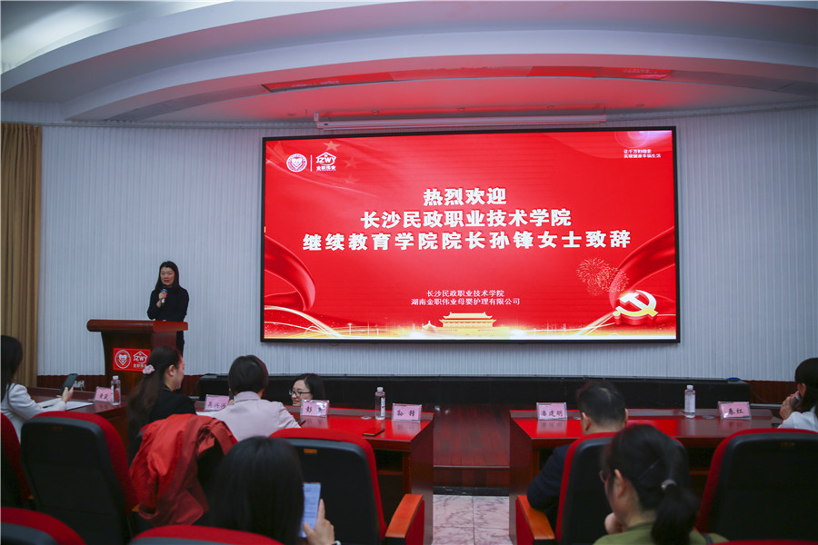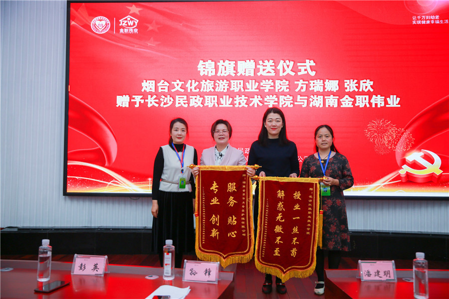 接著,山東煙臺文化旅游職業學院老師張欣、方瑞娜,為長沙民政職業技術學院和金職偉業贈予錦旗,以此表達學員們的謝意。錦旗鮮紅,數語寥寥,卻情深意重。