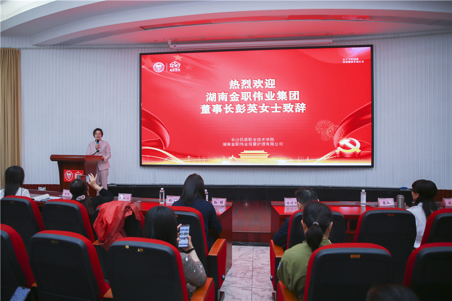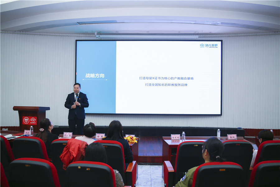 隨后,湖南金職偉業集團董事長彭英發表講話。彭總對這六天的學習培訓著重分享了三點,“一是感恩,首先感恩教育部的大好政策及長沙民政職業技術學院一直以來的大力支持,還要感謝各位講師的精彩授課以及各位專家老師不遠千里來到長沙參加此次培訓。二是創新,金職偉業作為一家年輕有力量的企業,擁有一支專業、高效的團隊,之后仍需不斷地沉淀、創新。三是期待,我真誠地期待各位專家、老師在回校之后,能夠積極地推動幼兒照護事業的實施落地,并成為1+X幼兒照護職業技能等級證書的傳播者,擔起造福民生的重任,培養出更多高素質幼教人才,真正幫助護理、早教等專業學子實現高薪就業,多渠道創業。”