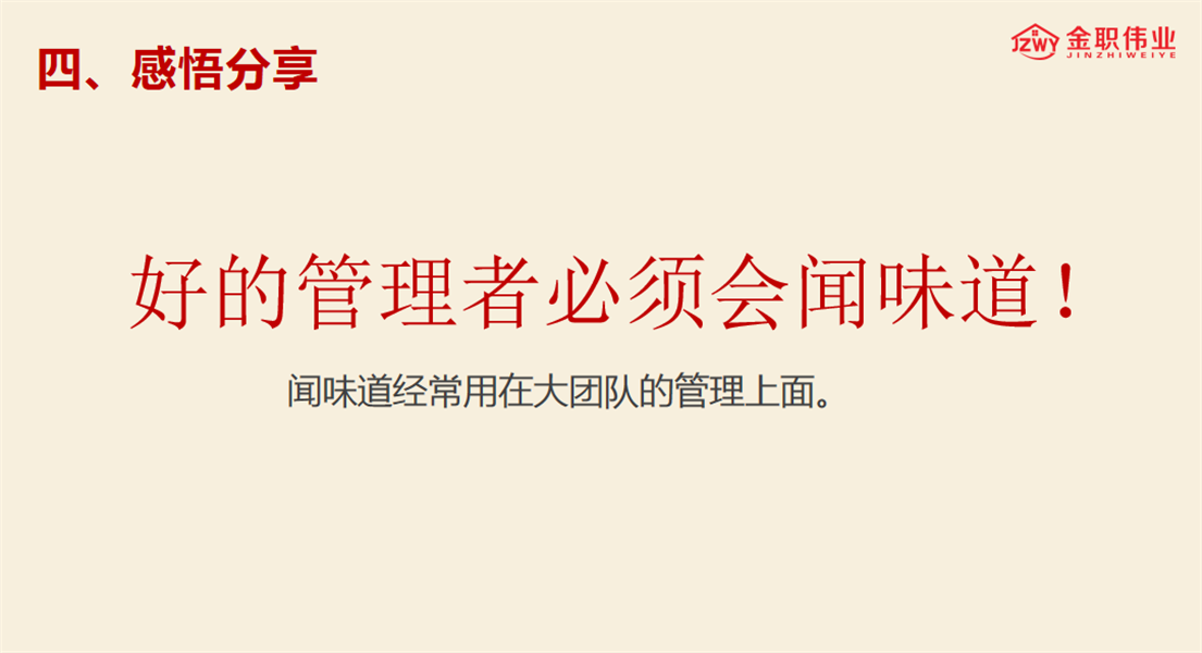 聞味道:觀察員工的情緒、氛圍,從中找到正面負面的信息。你要比別人更敏感地發現尚未萌芽的問題,它既代表你對未來的判斷,也代表你個人在靈魂、哲學、精神上的思考。
