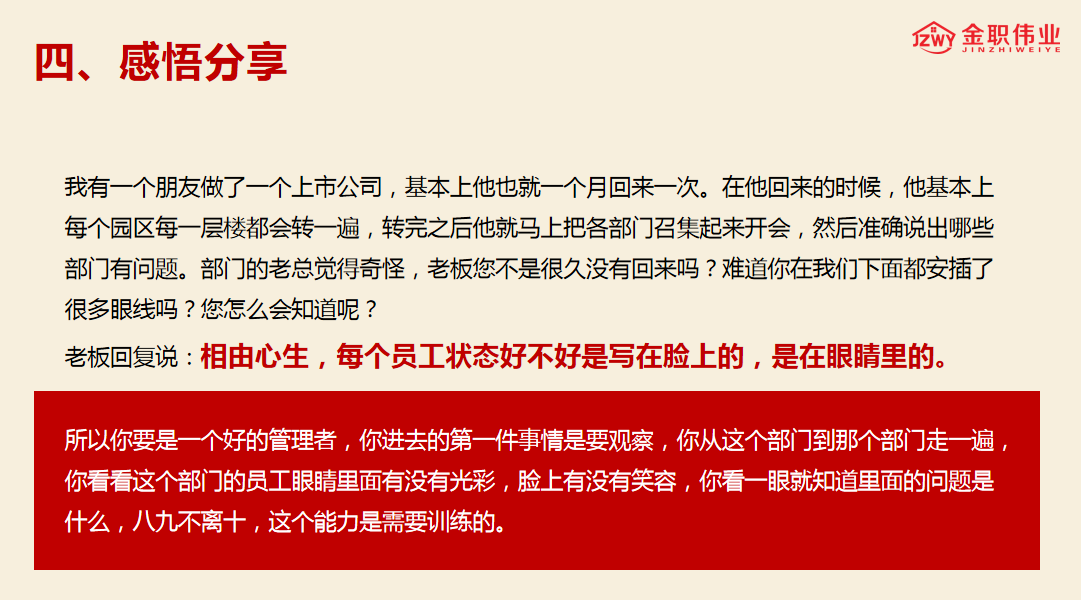 所以你要是一個好的管理者,你進去的第一件事情是要觀察,你從這個部門到那個部門走一遍,你看看這個部門的員工眼睛里面有沒有光彩,臉上有沒有笑容,你看一眼就知道里面的問題是什么,八九不離十,這個能力是需要訓練的。