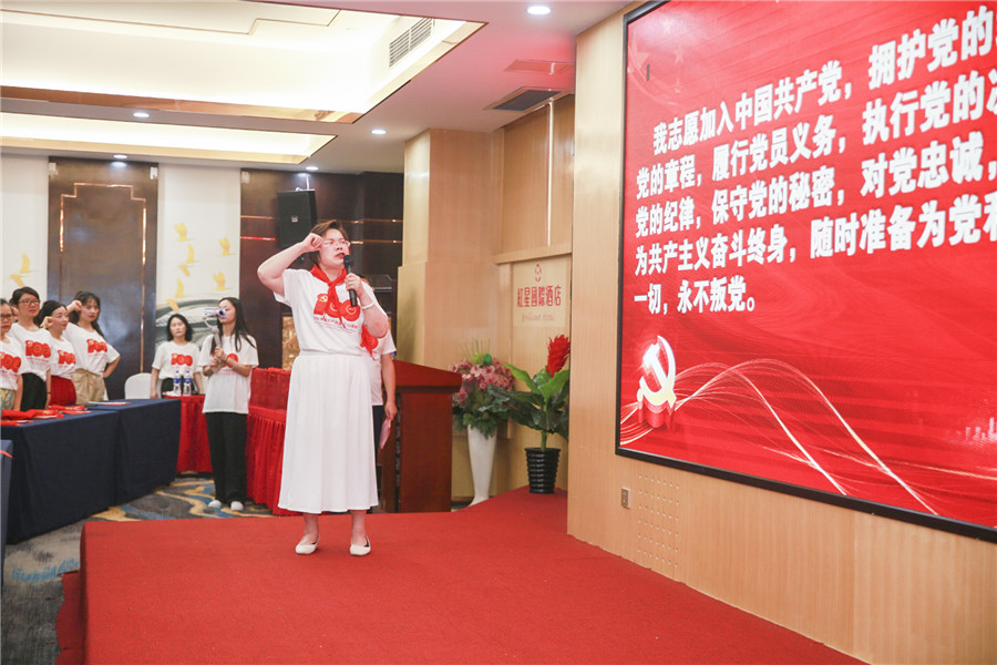 在金職偉業董事長彭英的帶領下,在座人員集體起立,握拳宣誓,“我志愿加入中國共產黨,擁護黨的綱領,遵守黨的章程,履行黨員義務……”一字一句,神圣而豪邁,錚錚誓言,堅定了理想與信念。雄關漫道真如鐵,而今邁步從頭越。每一次重溫,都是精神的淬煉;每一次對標,都是前行的起點。