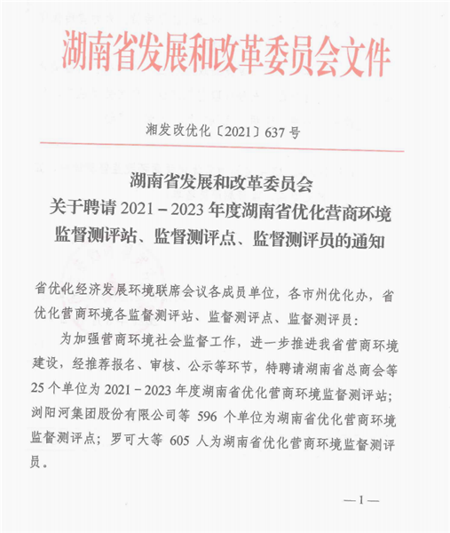 金職偉業獲評2021-2023湖南省優化經濟發展環境監督測評點