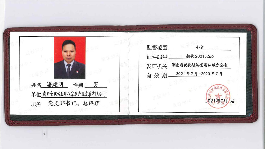 良好的環境是湖南經濟發展的“生命線”,是區域綜合競爭力的核心,優化經濟發展環境的重要性不言而喻。2021年7月,湖南金職偉業現代家庭產業發展有限公司(下稱“金職偉業”)從全省上百萬家企業中脫穎而出,被湖南省優化經濟發展環境辦公室選定為湖南省優化經濟發展環境監督測評點,湖南金職偉業現代家庭產業發展有限公司黨支部書記、總經理潘建明被選定為湖南省優化經濟發展環境監督測評員。此舉,旨在充分發揮省優化經濟發展環境監督測評站、點、員的監督作用,進一步完善優化經濟發展環境工作監管機制,暢通信息反饋情況。