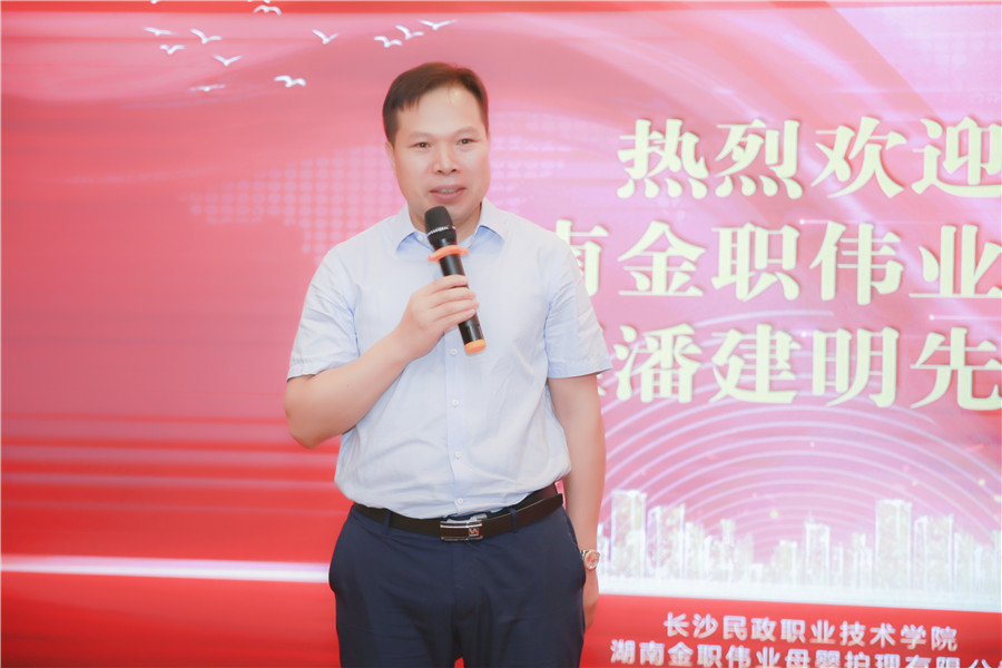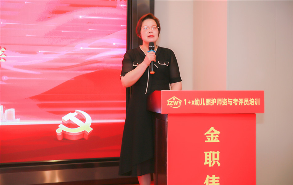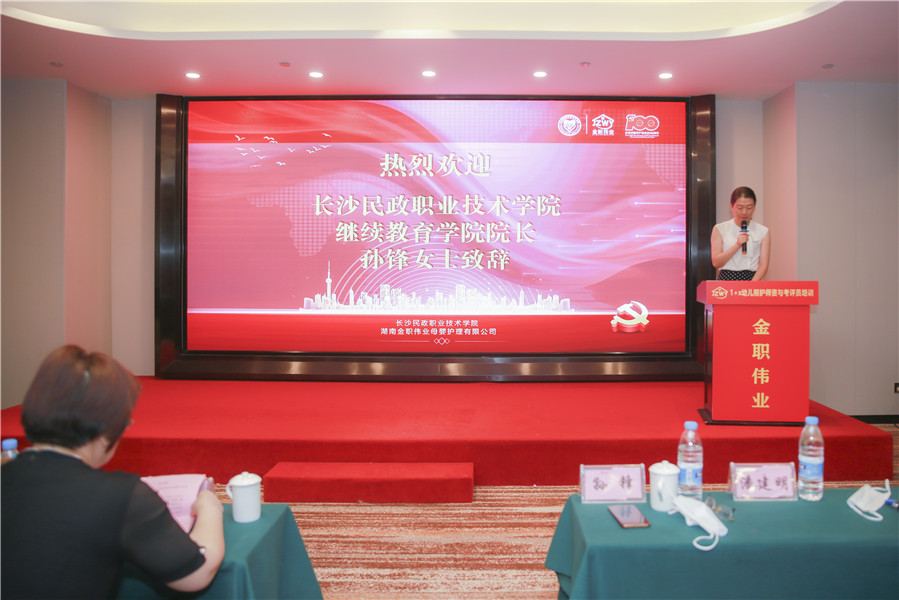 典禮伊始,長(zhǎng)沙民政職業(yè)技術(shù)學(xué)院繼續(xù)教育學(xué)院孫鋒院長(zhǎng)、金職偉業(yè)董事長(zhǎng)彭英率先發(fā)表致辭。孫院長(zhǎng)提到,國(guó)家高度重視幼兒照護(hù)等社會(huì)服務(wù)領(lǐng)域的人才培養(yǎng),推動(dòng)幼兒照護(hù)領(lǐng)域1+X證書制度落地,在教育、人才、產(chǎn)業(yè)方面,發(fā)布了一系列配套政策,作為職業(yè)院校應(yīng)抓住機(jī)遇,加快推進(jìn)人才培養(yǎng)模式的改革;一線教師應(yīng)該深入研究幼兒照護(hù)職業(yè)技能等級(jí)標(biāo)準(zhǔn),在課堂教學(xué)、課程標(biāo)準(zhǔn)制定、教材研發(fā)等方面融入標(biāo)準(zhǔn),讓學(xué)生能牢固掌握此項(xiàng)技能,為將來適應(yīng)職業(yè)崗位需求做好準(zhǔn)備。長(zhǎng)沙民政職業(yè)技術(shù)學(xué)院作為首批職業(yè)教育1+X證書制度推進(jìn)試點(diǎn)單位和雙高校建設(shè)單位,定會(huì)全力支持金職偉業(yè)的培訓(xùn)工作。彭英董事長(zhǎng)從國(guó)家政策、1+X證書工作成果、未來發(fā)展等多方面進(jìn)行全方位闡述,其中重點(diǎn)提及,國(guó)家支持各地中、高職開展1+X證書制度試點(diǎn),并匹配相對(duì)資金補(bǔ)貼,對(duì)于提升各大院校相關(guān)專業(yè)學(xué)子技能水平、拓寬就業(yè)渠道有重要意義。金職人擁抱偉大教育情懷,不斷協(xié)助試點(diǎn)院校開展證書培訓(xùn)與幼兒照護(hù)人才培養(yǎng)工作,持續(xù)推動(dòng)“崗、課、賽、證”融通,全面助力幼兒照護(hù)領(lǐng)域的復(fù)合型技能人才培養(yǎng)。