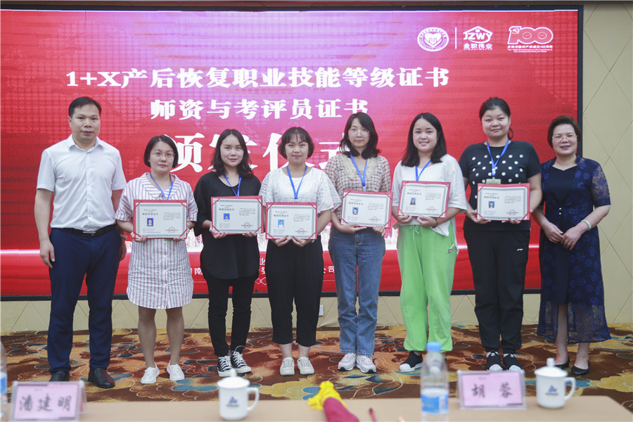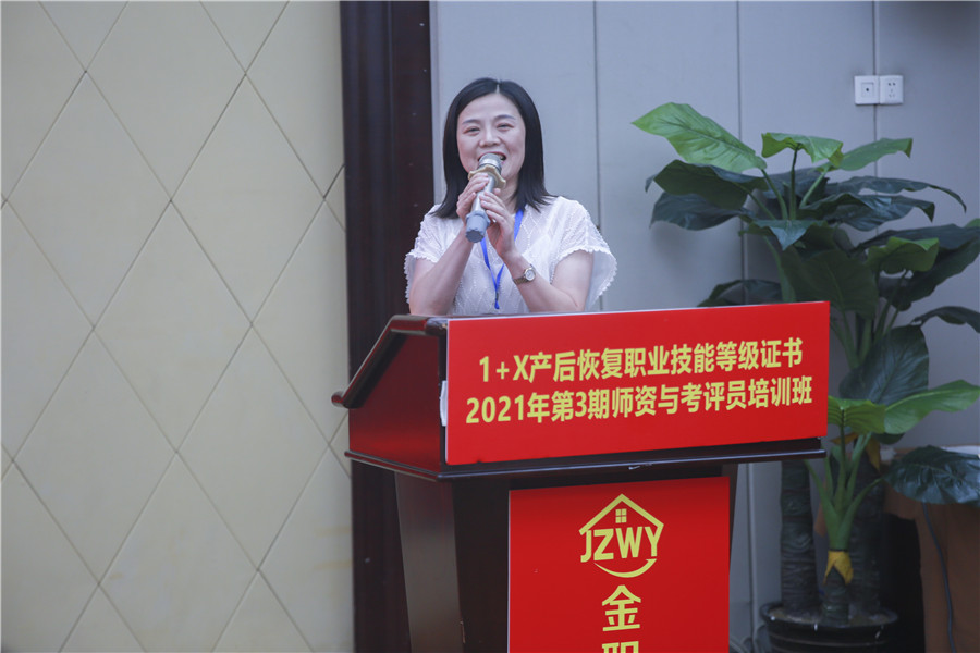 比賽結束后,1+X產后恢復職業技能等級證書第三期師資及考評員培訓結業典禮正式拉開序幕。金職偉業董事長彭英、總經理潘建明出席并發言。彭英董事長首先對此次競賽中各位老師展現出的教學能力及精神表示贊賞,并強調經過此次培訓,各位老師獲得了兩張證書,這不僅賦予了新的責任,也擔負了新的使命。“此次培訓到今天就正式結束了,今后,金職偉業將會吸取經驗,將1+X證書師資培訓做得更加專業,也希望各位老師在回校后,將學到的產后恢復知識靈活運用至校內,共同推動1+X產后恢復證書試點工作的落地。”金職偉業總經理潘建明分享道。