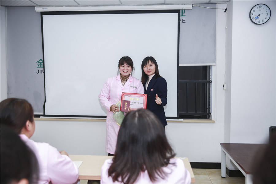 在一片掌聲中,462期高級母嬰保健師班班長羅云榮獲“優秀班干部”榮譽稱號。“我不是第一次參加金職偉業的培訓,之前有參加過母乳喂養指導課程的培訓。在兩次培訓中,共同的地方是老師都很專業,也讓我收獲了很多;不同的地方是結交了兩批來自不同地方的姐妹,也學到了不同的技能、知識。”在獲獎時,她分享道。