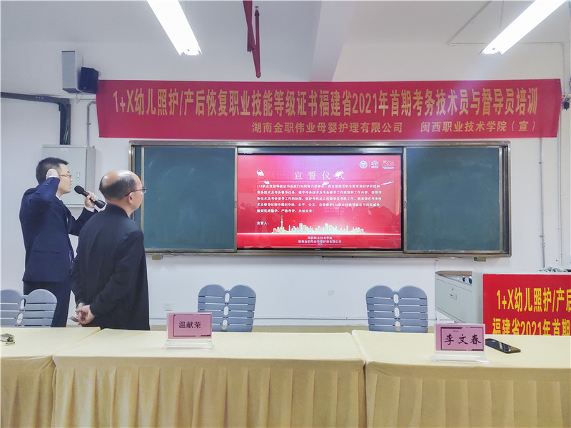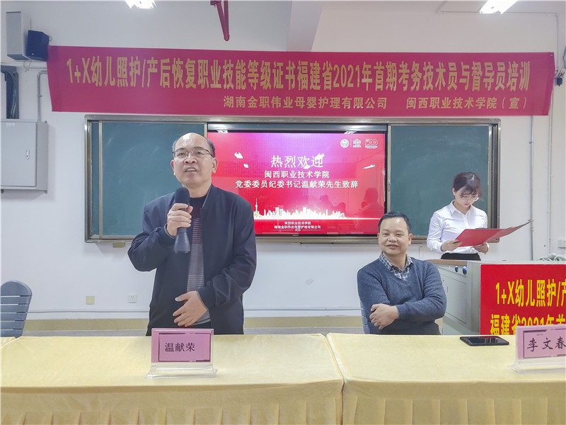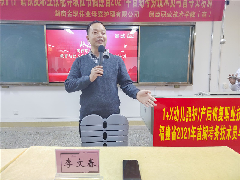 閩西職業技術學院紀委書記溫獻榮和閩西職業技術學院教育與藝術學院院長李文春發表講話。劉路永認為,考務技術員和督導員的技術支持是幼兒照護考評工作順利進行的關鍵,幼兒照護之路任重道遠,考務技術員和督導員們也要樹立終身學習的觀念,為幼兒照護的光明未來共同努力。李文春對參訓教師寄予厚望:“希望各位老師都能成為1+X幼兒照護、產后恢復職業技能等級證書的傳播者,踐行者,謹記使命,快速推動1+X幼兒照護、產后恢復職業技能等級證書在學校的落地,為托育、產后恢復行業培育更多高素質的技術技能型人才。”