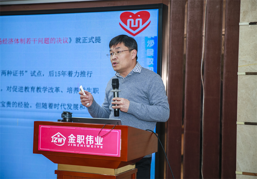 值得一提的是,此次培訓(xùn)特邀請長沙民政職業(yè)技術(shù)學(xué)院李斌校長作“職業(yè)類證書助力職業(yè)教育高質(zhì)量發(fā)展”主題授課,致力探索1+X證書高質(zhì)量發(fā)展、助力技能型社會建設(shè)路徑。李斌校長圍繞“從職業(yè)資格證書到職業(yè)類證書”、“崗課賽證綜合育人引領(lǐng)‘三教’改革”、“職業(yè)類證書育人實踐的現(xiàn)實路徑”三大版塊內(nèi)容進行了詳細(xì)講解。在李斌校長看來,深化產(chǎn)教融合、校企合作是國家關(guān)于教育和人才改革發(fā)展重大決策部署。“金職偉業(yè)、泰康珞珈研究院均與長沙民政職業(yè)技術(shù)學(xué)院共建產(chǎn)業(yè)學(xué)院,學(xué)校與企業(yè)建立長效、多元、深度的校企合作機制,能夠為社會源源不斷地輸送高素質(zhì)技術(shù)技能型人才,真正為技能型社會建設(shè)添磚加瓦。”