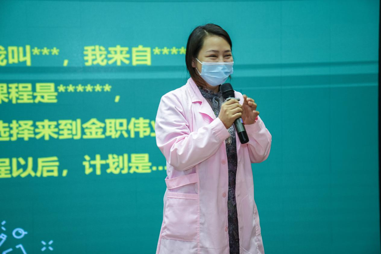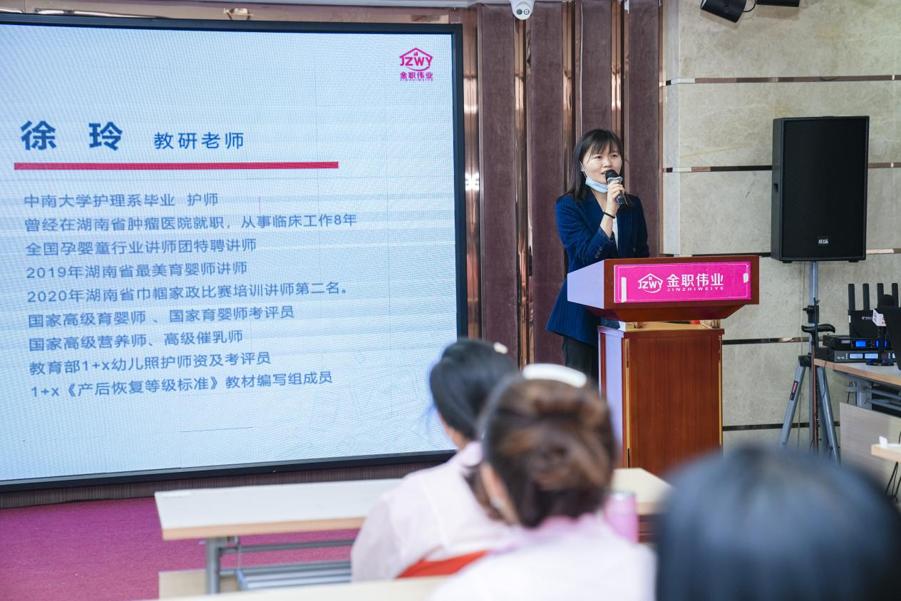 緊接著,金牌月嫂講師徐玲上臺進行了自我介紹及分享。她為學員們介紹了課程內容,幫助學員明確學習目的。同時也希望學員們能夠相信老師,用心學習,互幫互助,帶著對未來的期許,全力以赴,掌握更多的專業知識及技能。