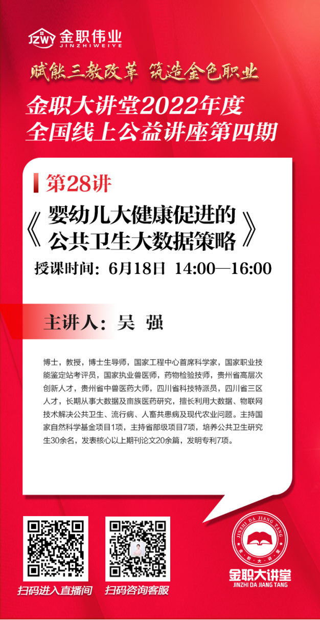 6月18日,金職大講堂將開啟第28講,此次課程邀請了國家工程中心首席科學家吳強就《嬰幼兒大健康促進的公共衛生大數據策略》進行主題授課。屆時,誠邀各位行業專家、院校老師共同參加與聆聽~