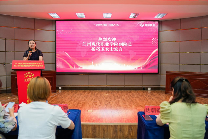 典禮伊始,蘭州現代職業學院楊巧玉副院長率先發表致辭。“首次,熱烈祝賀在座各位老師順利完成幼兒照護證書專業學習。此次培訓內容極其豐富、充實,相信大家通過這一個星期的學習,已經完全了解和熟悉了1+X證書制度,掌握了幼兒照護證書的標準和核心技能。”楊巧玉副院長希望,老師們在返校后,能互相保持聯系和溝通,交流分享課證融合工作中好的經驗和做法,互相取長補短、互相借鑒,真正把幼兒照護技能融入到相關專業課的教學中,培養適合職業崗位需求的學生。