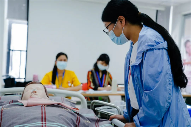 “用灌注器反抽老人胃液,見到胃液呈透明狀,說明胃管在胃內且胃液無異常。”這是考生正在進行養老護理員實操考試,她聲音堅定、操作專業,盡情地展示著自己的學習成果。