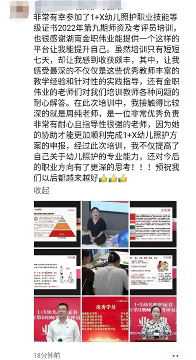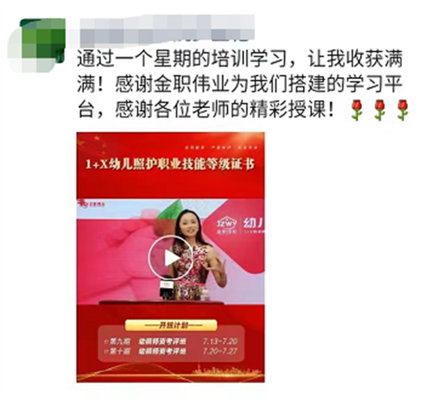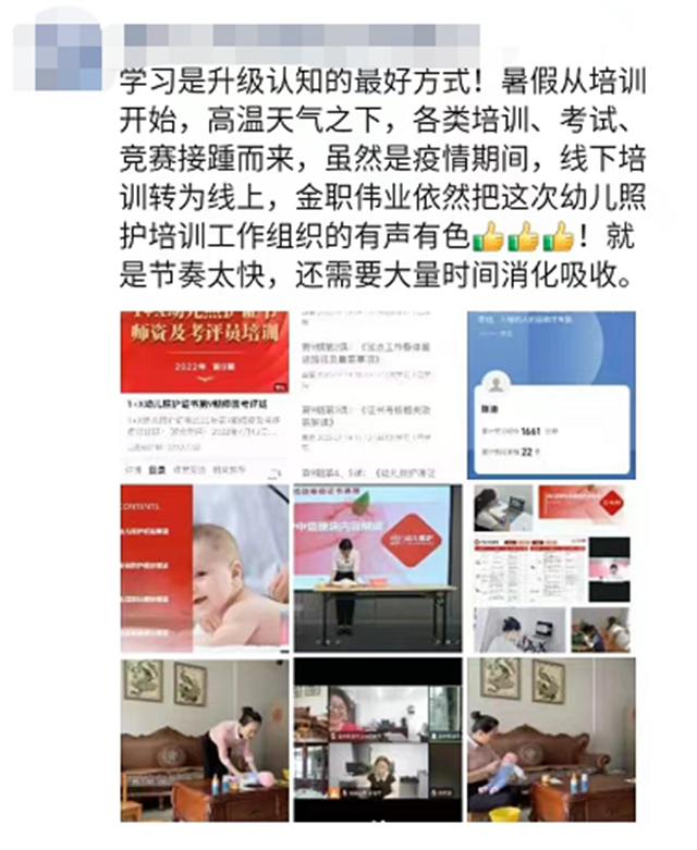 “教師興則教育興,教育興則國興。非常感謝大家對金職偉業的信任和支持,也由衷感恩大家在培訓期間克服諸多困難,堅持完成此次線上培訓。”金職偉業院校事業部總監周該生相信,隨著更多老師成為幼兒照護證書的專業師資和考評員,我國托育托幼行業將迎來更加明亮的未來。