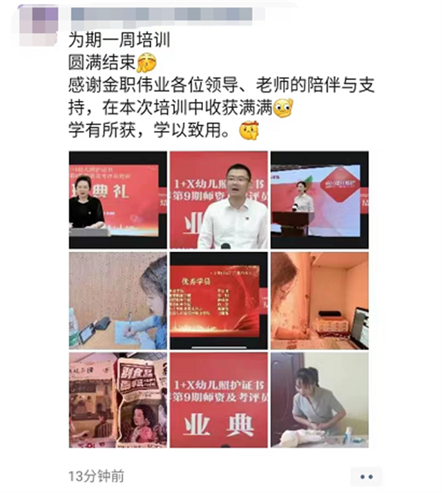 據了解,咸豐縣中等職業技術學校今年成功申報為1+X幼兒照護職業技能等級證書試點院校,申報審批總人數為200人,為全力推進1+X幼兒照護證書試點工作,落實人才培養方案,咸豐縣中等職業技術學校人文部覃月主任、陳思老師,積極報名參加了本次線上培訓。緊密的課程安排、繁多的課后作業、一輪又一輪的小程序測試,讓覃月主任從早上學至深夜,壓力倍增的她,發出了“這簡直就是高考氛圍”的感嘆。