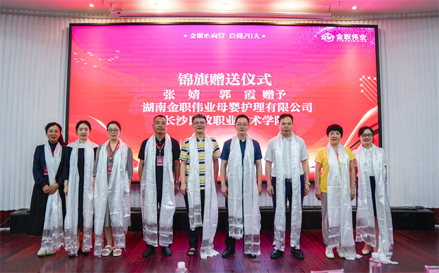 為表感謝,湟源縣職業技術學校張婧老師、青海省工業職業技術學校郭霞老師作為學員代表,為長沙民政職業技術學院、湖南金職偉業母嬰護理有限公司贈予錦旗,拉薩市第二中等職業技術學校李林副校長為其贈送哈達。