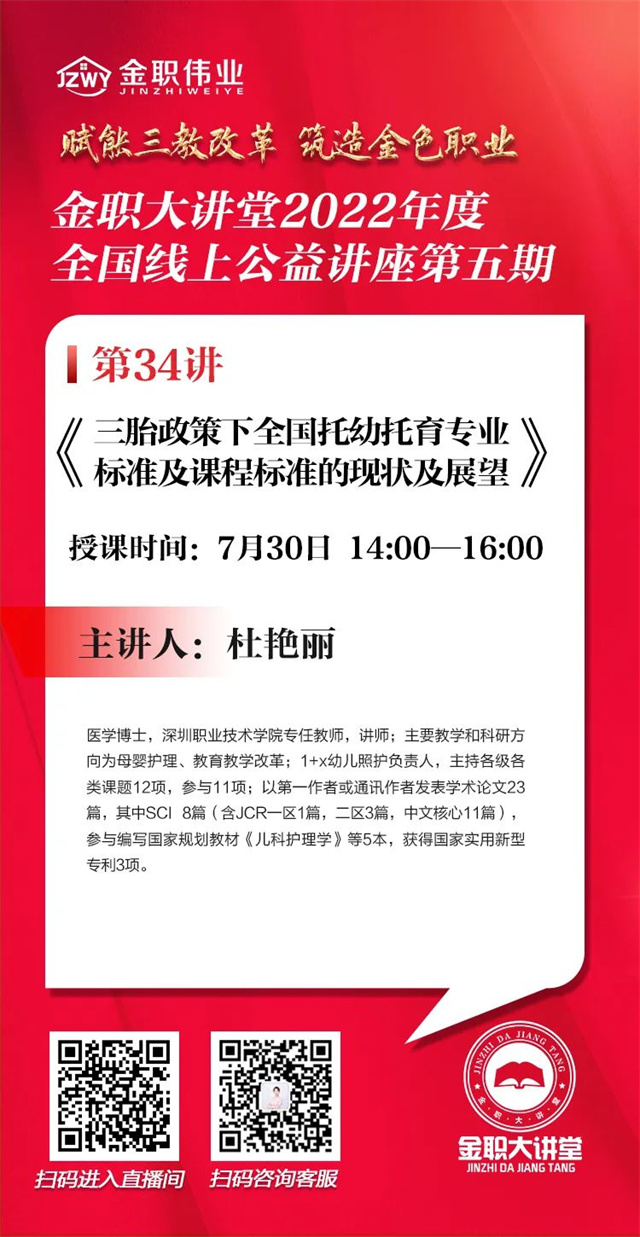 7月30日,金職大講堂將開啟第五期第34講,此次課程邀請了深圳職業技術學院杜艷麗老師就《三胎政策下全國托幼托育專業標準及課程標準的現狀及展望》進行主題授課。屆時,誠邀各位行業專家、院校老師共同參加與聆聽~