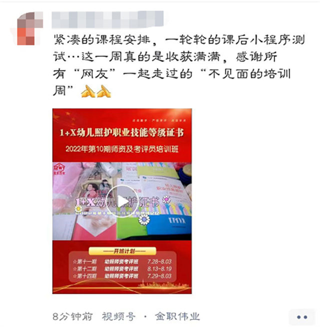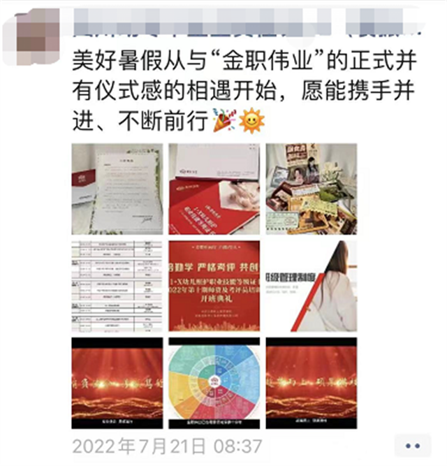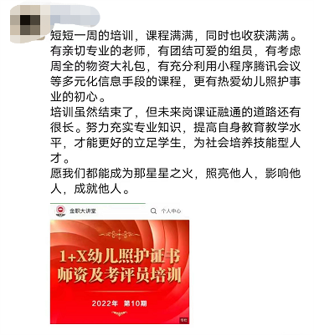 據了解,此次培訓為期七天半,全程以線上形式進行,為確保線上技能學習效果不打折,金職偉業結合線上教學特點,融入信息化教學,科學化設置實操及考評管理,同時提前錄制實操示范視頻、整理實操示范話術,上傳至金職母嬰官網,以老師們觀看和學習,獲得了廣泛認可。截至結業當天,學員線上跟課率100%,考核及格率100%。