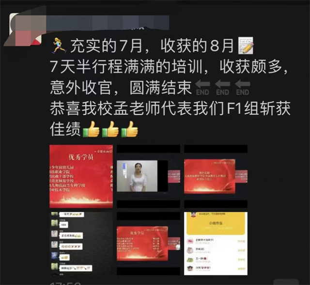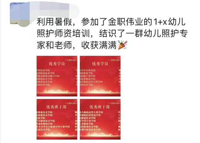 瀘州市職業技術學校藝術設計部幼兒保育專業羅譽老師從組織培訓的有條不紊、教學內容的豐富、后勤保障的貼心細致這三個方面表達了對金職偉業的贊揚。“這次的學習培訓是一次難得的充電機會,我將會學以致用,將學習的碩果融入日常教學中去,為幼兒照護人才培養貢獻自己的力量。”在這次線上培訓中,瀘州職業技術學校的16位老師自發在學校集中學習,她們相互溝通交流、共同進步,圓滿地完成了這次培訓,各有兩位老師獲評優秀學員與優秀班干部。