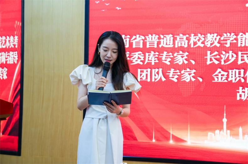 隨后,長沙民政職業技術學院教學咨詢與指導團隊專家、湖南省教育考試院藝術類考試評委庫專家胡蓉作點評,并宣布大賽獲獎名單。