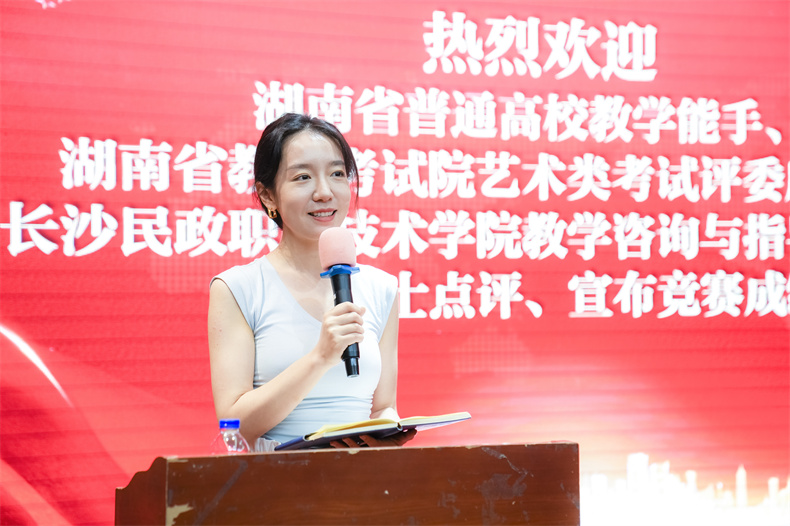 隨后,評委專家從內容設計、語言教態及思政融合等方面進行評分。長沙民政職業技術學院教學咨詢與指導團隊專家、湖南省教育考試院藝術類考試評委庫專家胡蓉作為代表進行現場點評,她就教學模式、教學步驟、教學資源、教學評價、課程思政五點進行分享,并強調教學資源不應局限于信息化資源,還應包括教師團隊、教學環境等要素。